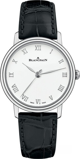 Часы Blancpain Villeret Ultra-Slim Automatic 29mm выпущены в круглом корпусе из нержавеющей стали. Размер составляет 29.2 x 9.24 мм, водонепроницаемость 30 м. Внутри корпуса установлен автоматический механизм, Калибр Blancpain 913, обеспечивающий запас хода 40 часов. На белом циферблате отображаются часы, минуты, секунды. Часы комплектуются ремешком из кожи аллигатора с вставкой из нержавеющей стали.