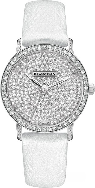 Часы Blancpain Villeret Ultra-Slim Automatic 29mm выпущены в круглом корпусе из белого золота 18к. Размер составляет 29.2 x 9.24 мм, водонепроницаемость 30 м. Внутри корпуса установлен автоматический механизм, Калибр Blancpain 93, обеспечивающий запас хода 40 часов. На циферблате из белых бриллиантов отображаются часы, минуты, секунды. Часы комплектуются кожаным ремешком с вставкой из белого золота 18к. Корпус инкрустирован белыми бриллиантами.