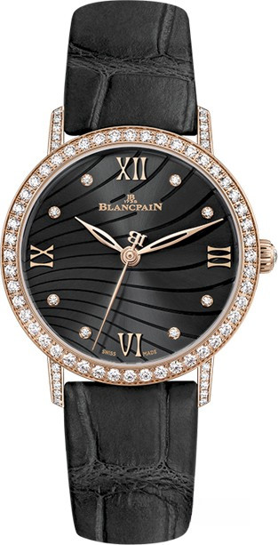 Часы Blancpain Villeret Ultra-Slim Automatic 29mm выпущены в круглом корпусе из розового золота 18к. Размер составляет 29.2 x 9.24 мм, водонепроницаемость 30 м. Внутри корпуса установлен автоматический механизм, Калибр Blancpain 953, обеспечивающий запас хода 40 часов. На черном циферблате с 8-ю белыми бриллиантами отображаются часы, минуты, секунды. Часы комплектуются черным ремешком из кожи аллигатора с застежкой из розового золота 18к. Безель из белых бриллиантов.