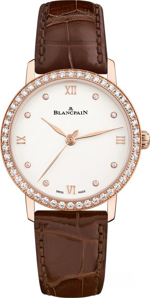 Часы Blancpain Villeret Ultra-Slim Automatic 29mm выпущены в круглом корпусе из розового золота 18к. Размер составляет 29.2 x 9.24 мм, водонепроницаемость 30 м. Внутри корпуса установлен автоматический механизм, Калибр Blancpain 93, обеспечивающий запас хода 40 часов. На белом циферблате с 8-ю белыми бриллиантами отображаются часы, минуты, секунды. Часы комплектуются ремешком из кожи аллигатора с вставкой из розового золота 18к. Безель из белых бриллиантов.