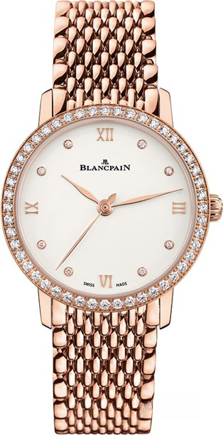 Часы Blancpain Villeret Ultra-Slim Automatic 29mm выпущены в круглом корпусе из розового золота 18к. Размер составляет 29.2 x 9.24 мм, водонепроницаемость 30 м. Внутри корпуса установлен автоматический механизм, Калибр Blancpain 913, обеспечивающий запас хода 40 часов. На белом циферблате с 8-ю белыми бриллиантами отображаются часы, минуты, секунды. Часы комплектуются браслетом из розового золота 18к. Безель из белых бриллиантов.