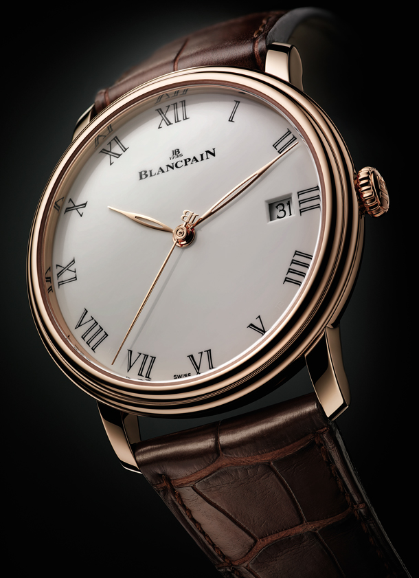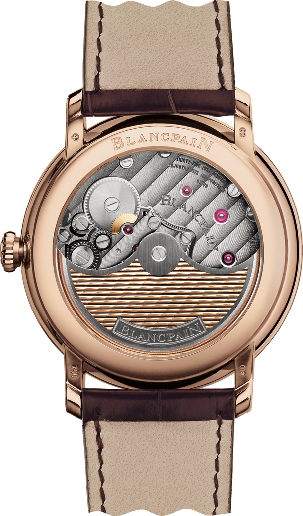 Коллекция Villeret олицетворяет собой основные принципы Blancpain – абсолютный приоритет за аутентичностью и уважение к традициям. Новинка 2014 года – часы с автоподзаводом, тремя стрелками и индикацией даты, великолепный эмалевый циферблат которых выполнен в технике гран фё (grand feu). Использование техники горячего эмалирования гран фё подтверждает глубокую привязанность Blancpain к историческим ремеслам часового дела. Только игра света на эмалевом циферблате позволяет увидеть выписанный тон в тон между цифрами IV и V , VII и VIII логотип «JB», как отсылку к традиции - такой тайнописью эмальеры с давних пор подписывают свои работы. Излучающая ауру врожденного изящества, новая модель с ее круглым двухступенчатым корпусом из красного золота и вырезанными стрелками в форме листа шалфея органично вписалась в эстетическую концепцию коллекции Villeret. Лаконичный дизайн циферблата оживляет окошко даты в положении «3» часа, а также бег центральной секундной стрелки. Задняя крышка корпуса из сапфирового стекла позволяет любоваться тонкой отделкой механизма с декором Côtes de Genève на мостах и сотовидным узором на инерционном грузе (роторе автоподзавода). Эти механические часы с автоподзаводом приводятся в действие собственным, мануфактурным Калибром 1335 , в котором красота сочетается с 8 -дневным запасом хода, свидетельством высочайшего технического мастерства часовщиков Мануфактуры, которое, несомненно, будет высоко оценено истинными ценителями часов. Снабженные ремешком шоколадного цвета из кожи аллигатора, эти новые часы диаметром 42 мм являются знаковым дополнением к знаменитой коллекции Villeret.