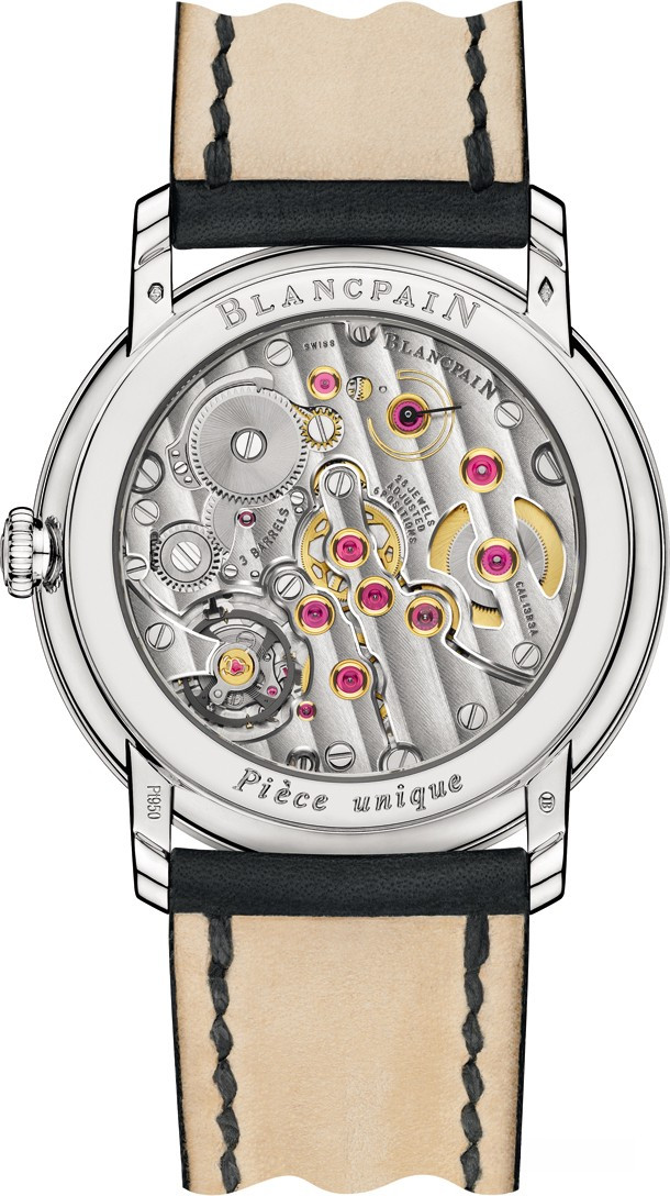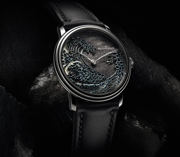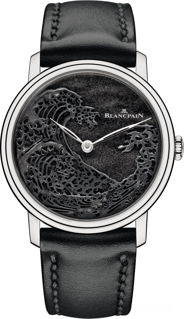 Вдохноленная движением волн океана последняя разработка Métiers d’Art выделяет драгоценный камень, впервые использованный Blancpain – мексиканский серебряный обсидиан – так же как и любимую технику Blancpain: японскую патину «рокушо». Для этой модели Blancpain модернизировал знаменитый калибр 13R0 с ручным подзаводом, который теперь стал 13R3A. Запас хода появился со стороны моста для того, чтобы обеспечить достаточно места для гарантии оптимальной просматриваемости гравировки. Механизм с его 8-дневным запасом хода снабжен тремя попарно связанными заводными барабанами, которые последовательно заводятся и расслабляются. Второй барабан служит как ретранслятор для первого, пополняя свою энергию, чтобы набрать запас для поддержания своей энергии, и в свою очередь завести третий барабан. Корпус с двойной ступенькой выполнен в платине. Blancpain предпочел ремешок из телячьей кожи, разработанный по заказу местным мастером. Его грозовой серый цвет идеально сочетается с уникальным загадочным часовым шедевром.