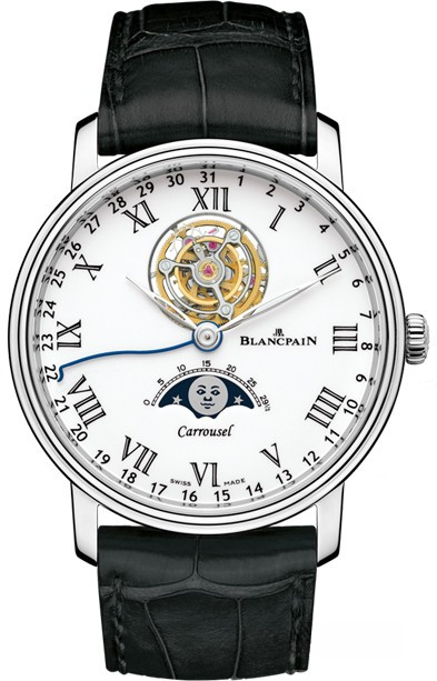Blancpain представляет новую модель, в которой объединились два знаковых часовых усложнения марки: карусель и индикатор фазы Луны. Новый механизм Blancpain 225L впервые объединил в себе карусель с индикаторами фазы Луны и даты. Основная задача карусели, как и турбийона, - уменьшить влияние гравитации на точность хода часов. Различие между этими двумя устройствами заключается в их конструкции. В то время как турбийон связан с барабаном посредством одной зубчатой передачи, карусель соединена с барабаном через систему двух зубчатых передач: первая передает энергию, необходимую для работы спускового механизма, а вторая управляет скоростью вращения каретки. Индикация фазы Луны - еще одно усложнение, использованное в новой модели, - также пребывала в полном забвении, пока Blancpain не вернула ее к жизни в начале 1980-х. Новый, максимально защищенный механизм Blancpain 225L, состоящий из 281 компонента, включая 61 только для каретки карусели, оснащен кремниевой спиралью баланса и наделен 5-дневным запасом хода. Новинка несет в себе все эстетические коды коллекции Villeret. Двухступенчатый корпус обрамляет чуть выпуклый белый циферблат, декорированный в технике горячего эмалирования гран фё; индикация даты осуществляется с помощью змеевидной стрелки из вороненой стали; а центральные часовая и минутная стрелки, грациозно скользящие по нарисованным эмалевым римским цифрам, имеют форму листа шалфея. В специальном окошке в положении «12» часов располагается каретка карусели с ее сложным механизмом; строго напротив, на отметке «6» часов, размещен индикатор фазы Луны. С обратной стороны 42-мм корпуса под ушками расположены две кнопки, предназначенные для коррекции показаний даты и фазы Луны.