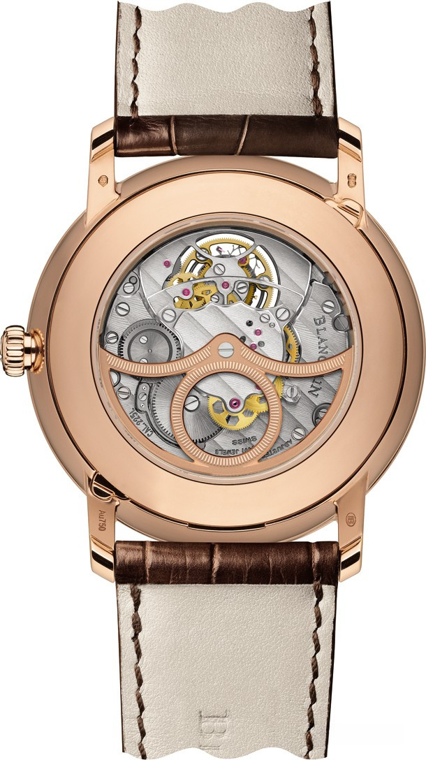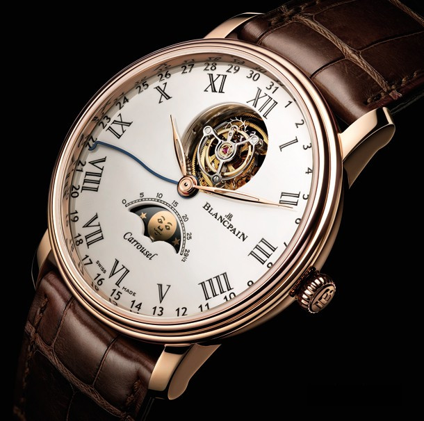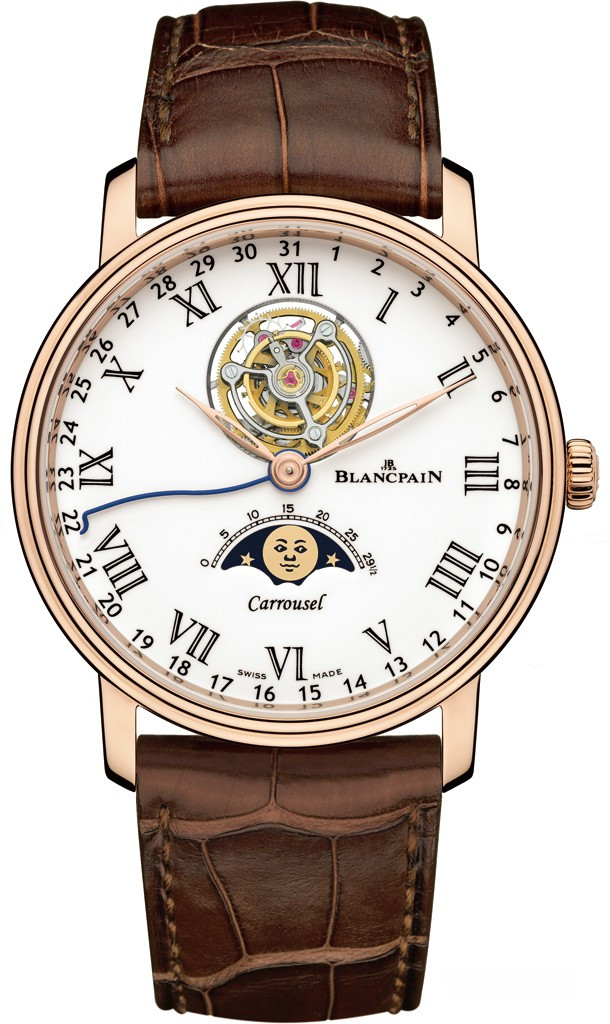Blancpain представляет новую модель, в которой объединились два знаковых часовых усложнения марки: карусель и индикатор фазы Луны. Новый механизм Blancpain 225L впервые объединил в себе карусель с индикаторами фазы Луны и даты. Основная задача карусели, как и турбийона, - уменьшить влияние гравитации на точность хода часов. Различие между этими двумя устройствами заключается в их конструкции. В то время как турбийон связан с барабаном посредством одной зубчатой передачи, карусель соединена с барабаном через систему двух зубчатых передач: первая передает энергию, необходимую для работы спускового механизма, а вторая управляет скоростью вращения каретки. Индикация фазы Луны - еще одно усложнение, использованное в новой модели, - также пребывала в полном забвении, пока Blancpain не вернула ее к жизни в начале 1980-х. Новый, максимально защищенный механизм Blancpain 225L, состоящий из 281 компонента, включая 61 только для каретки карусели, оснащен кремниевой спиралью баланса и наделен 5-дневным запасом хода. Новинка несет в себе все эстетические коды коллекции Villeret. Двухступенчатый корпус обрамляет чуть выпуклый белый циферблат, декорированный в технике горячего эмалирования гран фё; индикация даты осуществляется с помощью змеевидной стрелки из вороненой стали; а центральные часовая и минутная стрелки, грациозно скользящие по нарисованным эмалевым римским цифрам, имеют форму листа шалфея. В специальном окошке в положении «12» часов располагается каретка карусели с ее сложным механизмом; строго напротив, на отметке «6» часов, размещен индикатор фазы Луны. С обратной стороны 42-мм корпуса под ушками расположены две кнопки, предназначенные для коррекции показаний даты и фазы Луны.