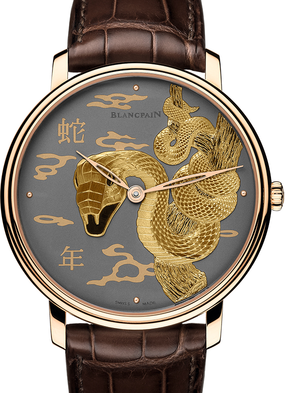 Часы Blancpain Villeret Damasquinee 6615B-3612-55B выпущены в круглом корпусе из розового золота 18к. Размер составляет 40 х 12,98 мм, водонепроницаемость 30 м. Внутри корпуса установлен автоматический механизм, Калибр Blancpain 15B, обеспечивающий запас хода 40 часов. На сером циферблате с мотивом 'змея' отображаются часы, минуты. Часы комплектуются ремешком из кожи аллигатора с вставкой из розового золота 18к.