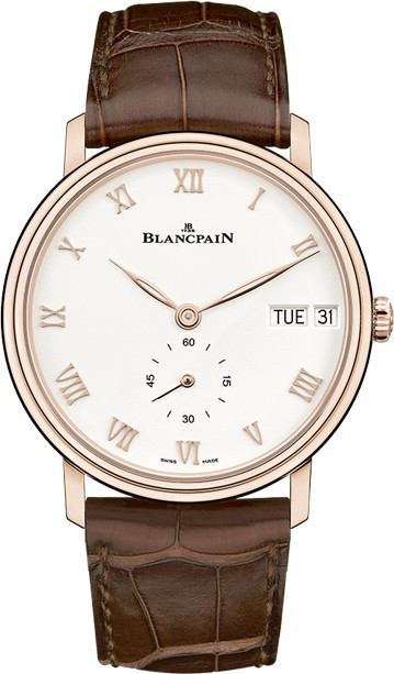 Часы Blancpain Villeret Day Date представлены в корпусе из розового золота 18к размером 40 мм и водонепроницаемостью 30 метров. Внутри корпуса установлен автоматический механизм Калибр 1160DD с запасом хода 72 часа. На белом циферблате отображаются часы, минуты, секунды, дата, день недели. Часы комплектуются коричневым ремешком из кожи аллигатора с вставкой из розового золота 18к.
