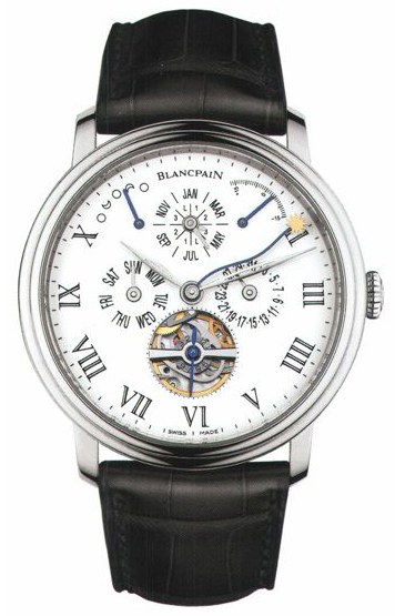 Астрономические часы Blancpain Villeret Equation of Time 6638-3431-55B с вечным календарем и турбийоном выпущены в круглом корпусе из платины. Размер составляет 42 х 12 мм, водонепроницаемость 30 м. Внутри корпуса установлен автоматический механизм, Калибр Blancpain 3863, обеспечивающий запас хода 72 часа. На белом циферблате отображаются часы, минуты, секунды, дата, день недели, месяц, фаза луны, уравнение времени. Часы комплектуются ремешком из кожи аллигатора с платиновой вставкой.