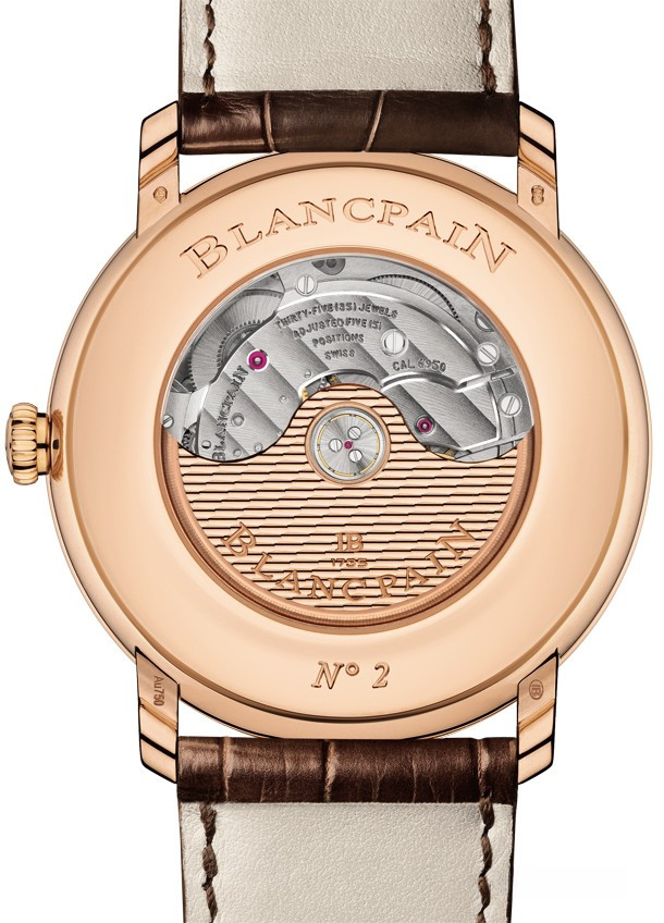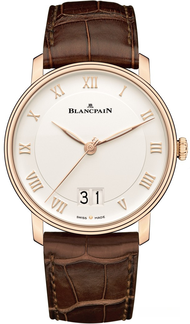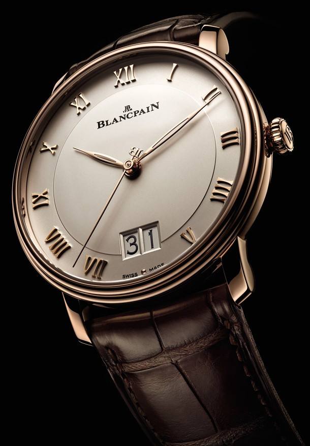 Впервые в коллекции Villeret, самой классической из всех в ассортименте Blancpain, появилась модель с «большой датой». Когда часовщики Blancpain представляли себе калибр 6950, они имели своей целью повысить степень читаемости даты и одновременно обеспечить мгновенную ее сменяемость ровно в полночь. Результатом разработки стал автоматический механизм с двумя заводными барабанами и с ударостойким механизмом индикации даты. Villeret Grande Date гармонично вписывается в классическую коллекцию Villeret. Ключевые опознавательные элементы часов Villeret органично вплетены в дизайн новинки. Характерный двухступенчатый корпус выполнен из красного золота и имеет диаметр 40 мм. На опаловом циферблате разместились римские цифры, стрелки из красного золота, окошко даты на отметке «6» часов. Прозрачная задняя крышка из сапфирового стекла позволяет оценить отделку механизма с сотовидным декором на роторе. Завершает ансамбль ремешок из кожи аллигатора шоколадно-коричневого цвета.