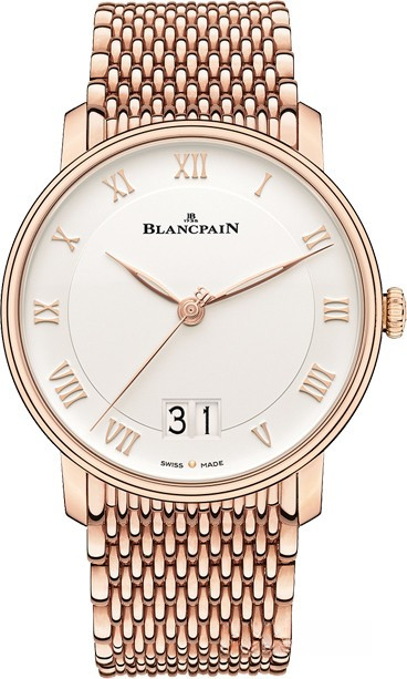Впервые в коллекции Villeret, самой классической из всех в ассортименте Blancpain, появилась модель с «большой датой». Когда часовщики Blancpain представляли себе Калибр 6950, они имели своей целью повысить степень читаемости даты и одновременно обеспечить мгновенную ее сменяемость ровно в полночь. Результатом разработки стал автоматический механизм с двумя заводными барабанами и с ударостойким механизмом индикации даты. Villeret Grande Date гармонично вписывается в классическую коллекцию Villeret. Ключевые опознавательные элементы часов Villeret органично вплетены в дизайн новинки. Характерный двухступенчатый корпус выполнен из нержавеющей стали и имеет диаметр 40 мм. На белом циферблате разместились римские цифры, стрелки, окошко даты на отметке «6» часов. Прозрачная задняя крышка из сапфирового стекла позволяет оценить отделку механизма с сотовидным декором на роторе. Завершает ансамбль браслет из нержавеющей стали.