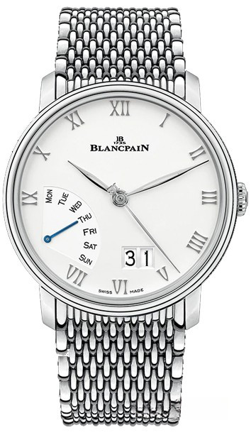 Часы Blancpain Villeret Grande Date Jour Retrograde представлены в корпусе из нержавеющей стали размером 40 х 11.1 мм и водонепроницаемостью 30 метров. Внутри корпуса установлен автоматический механизм, Калибр 6950GJ с запасом хода 72 часа. На белом циферблате отображаются часы, минуты, секунды, дата, день недели. Часы поставляются на браслете из нержавеющей стали.