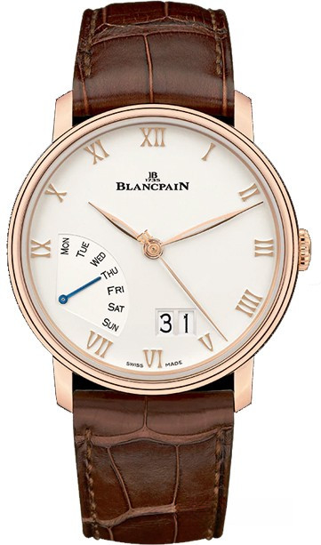 Часы Blancpain Villeret Grande Date Jour Retrograde представлены в корпусе из розового золота 18к размером 40 х 11.1 мм и водонепроницаемостью 30 метров. Внутри корпуса установлен автоматический механизм, Калибр 6950GJ с запасом хода 72 часа. На белом циферблате отображаются часы, минуты, секунды, дата, день недели. Часы поставляются на ремешке из кожи аллигатора с вставкой из розового золота 18к.