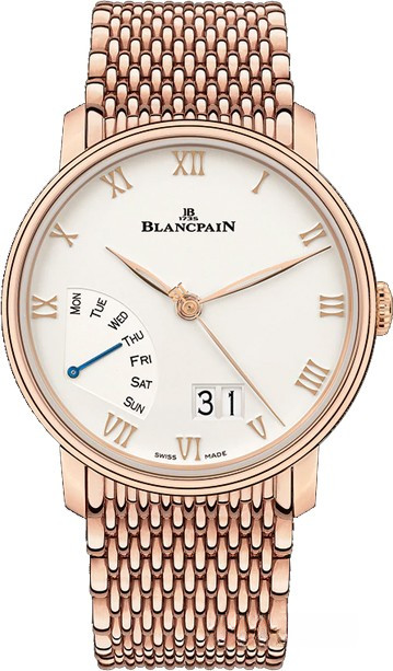 Часы Blancpain Villeret Grande Date Jour Retrograde представлены в корпусе из розового золота 18к размером 40 х 11.1 мм и водонепроницаемостью 30 метров. Внутри корпуса установлен автоматический механизм, Калибр 6950GJ с запасом хода 72 часа. На белом циферблате отображаются часы, минуты, секунды, дата, день недели. Часы поставляются на браслете из розового золота 18к.