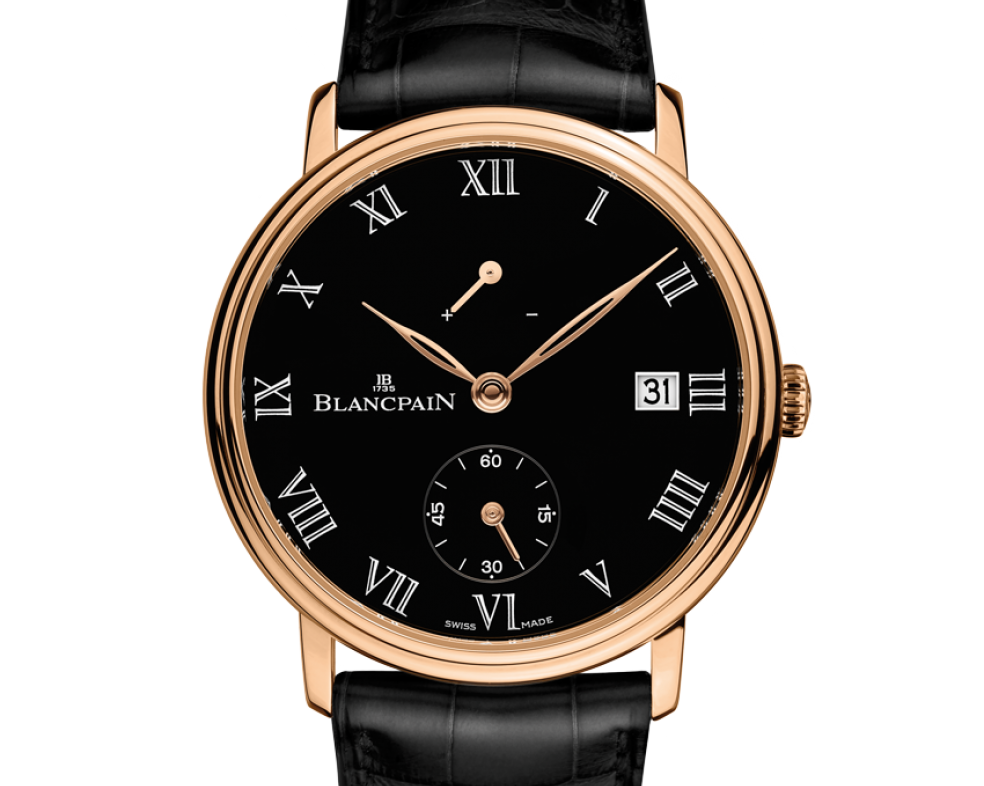 Часы Blancpain Villeret Manual Winding Power Reserve '8 Jours' 6614-3637-55B выпущены в круглом корпусе из розового золота 18к. Размер составляет 42 х 10,55 мм, водонепроницаемость 30 м. Внутри корпуса установлен автоматический механизм, Калибр Blancpain 13R0, обеспечивающий запас хода 8 дней. На циферблате с черной эмалью 'grand feu' отображаются часы, минуты, секунды, дата, запас хода. Часы комплектуются ремешком из кожи аллигатора с вставкой из розового золота 18к.