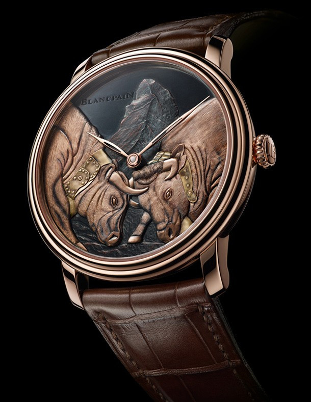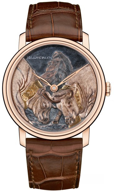 На циферблате часов Blancpain Villeret Metiers d'Art Shakudo изображена битва королевских коров на фоне символа Швейцарии — горы Маттерхорн. Золотые фигурки коров закреплены на циферблате, изготовленном из сплава золота и меди шакудо (shakud?), вся композиция покрыта патиной рокушо и помещена в 42-миллиметровый корпус из красного золота толщиной 10.55 мм. Двухстрелочная индикация базируется на основе 8-дневного механизма с ручным заводом 13R3A, высококлассное исполнение и прекрасную финишную отделку которого позволяет оценить сапфировое стекло задней крышки корпуса.