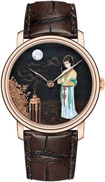 На циферблате часов Blancpain Villeret Metiers d'Art Diao Chan изображена китайская красавица Дяочань в технике эмали. Вся композиция помещена в 42-миллиметровый корпус из красного золота толщиной 10.55 мм. Двухстрелочная индикация базируется на основе 8-дневного механизма с ручным заводом 13R3A, высококлассное исполнение и прекрасную финишную отделку которого позволяет оценить сапфировое стекло задней крышки корпуса. Часы поставляются на ремешке из кожи аллигатора. Серия ограничена 1 шт.