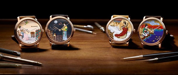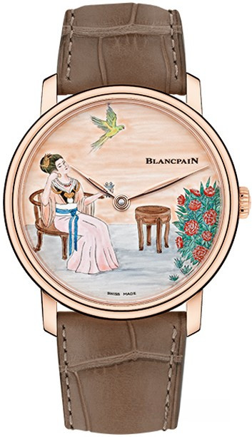 На циферблате часов Blancpain Villeret Metiers d'Art Yang Guifei изображена китайская красавица Ян Гуйфей в технике эмали. Вся композиция помещена в 42-миллиметровый корпус из красного золота толщиной 10.55 мм. Двухстрелочная индикация базируется на основе 8-дневного механизма с ручным заводом 13R3A, высококлассное исполнение и прекрасную финишную отделку которого позволяет оценить сапфировое стекло задней крышки корпуса. Часы поставляются на ремешке из кожи аллигатора. Серия ограничена 1 шт.