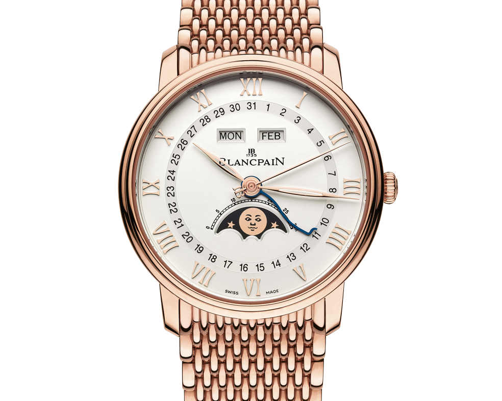 Астрономические часы Blancpain Villeret Moon Phase Complete Calendar 40mm 6654-3642-MMB выпущены в круглом корпусе из розового золота, 18к. Размер составляет 40 х 10,65 мм, водонепроницаемость 30 м, часы со специальными коректорами индикации под задней открывающееся крышкой. Внутри корпуса установлен автоматический механизм, Калибр 6654, обеспечивающий запас хода 72 часа. На белом циферблате отображаются часы, минуты, секунды, дата, день недели, месяц, фаза луны. Часы комплектуются браслетом из розового золота 18к.