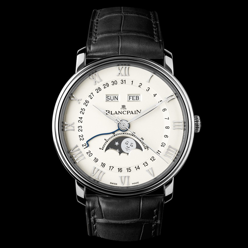 Астрономические часы Blancpain Villeret Moon Phase Complete Calendar 40mm 6654-1127-55B выпущены в круглом корпусе из нержавеющей стали. Размер составляет 40 х 10,65 мм, водонепроницаемость 30 м, часы со специальными корректорами индикации под ушками. Внутри корпуса установлен автоматический механизм, Калибр 6654, обеспечивающий запас хода 72 часа. На белом циферблате отображаются часы, минуты, секунды, дата, день недели, месяц, фаза луны. Часы комплектуются ремешком из кожи аллигатора с вставкой из нержавеющей стали.