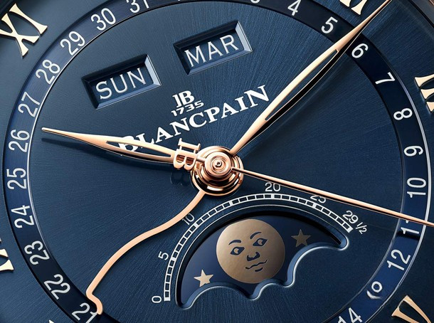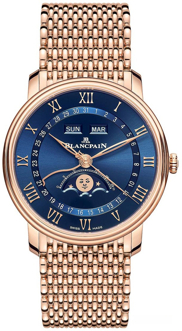 Часы Blancpain Villeret Quantieme Complet представлены в корпусе из розового золота 18к размером 40 х 10.94 мм и водонепроницаемостью 30 метров. Внутри корпуса установлен автоматический механизм, Калибр 6654, обеспечивающий запас хода 72 часа. На синем циферблате отображаются часы, минуты, секунды, дата, день недели, месяц, фаза луны. Часы поставляются на браслете из розового золота 18к.