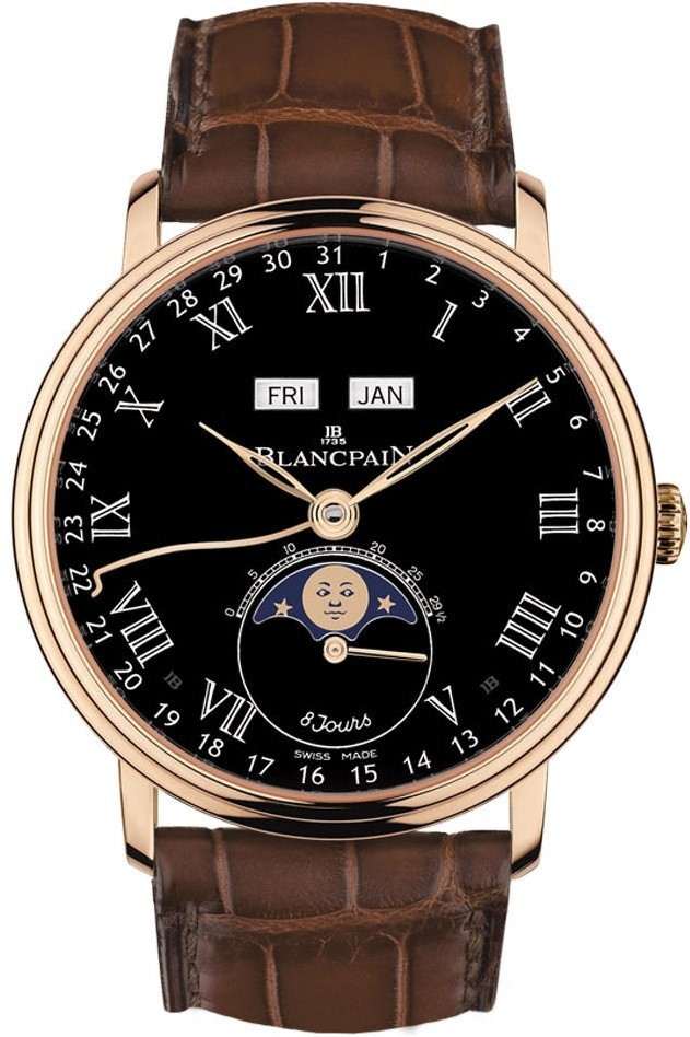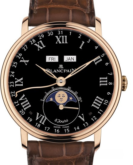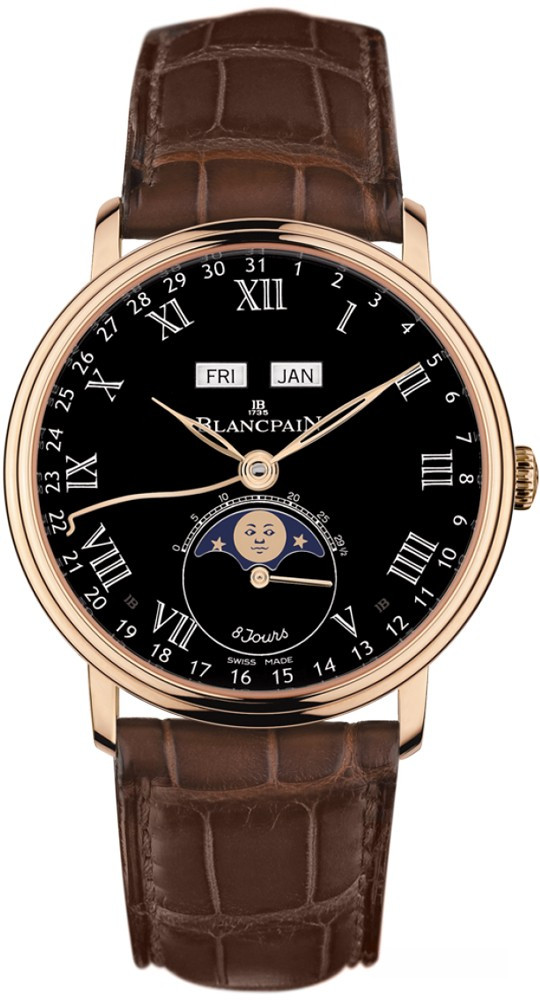 Астрономические часы Blancpain Villeret Moon Phase Complete Calendar '8 Jours' 6639-3637-55B выпущены в круглом курпусе из розового золота, 18к. Размер составляет 42 х 13,7 мм, водонепроницаемость 30 м, часы со специальными корректорами индикации под ушками. Внутри корпуса установлен автоматический механизм, Калибр Blancpain 6639, обеспечивающий запас хода 8 дней. На черном циферблате с эмалью 'grand feu' отображаются часы, минуты, секунды, дата, день недели, месяц, фаза луны. Часы комплектуются ремешком из кожи аллигатора с вставкой из розового золота, 18к.