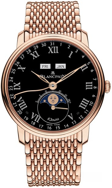 Астрономические часы Blancpain Villeret Moon Phase Complete Calendar '8 Jours' 6639-3637-MMB выпущены в круглом курпусе из розового золота 18к. Размер составляет 42 х 13.7 мм, водонепроницаемость 30 м, часы со специальными коректорами индикации под ушками. Внутри корпуса установлен автоматический механизм, Калибр Blancpain 6639, обеспечивающий запас хода 8 дней. На черном циферблате отображаются часы, минуты, секунды, дата, день недели, месяц, фаза луны. Часы комплектуются браслетом из розового золота 18к.