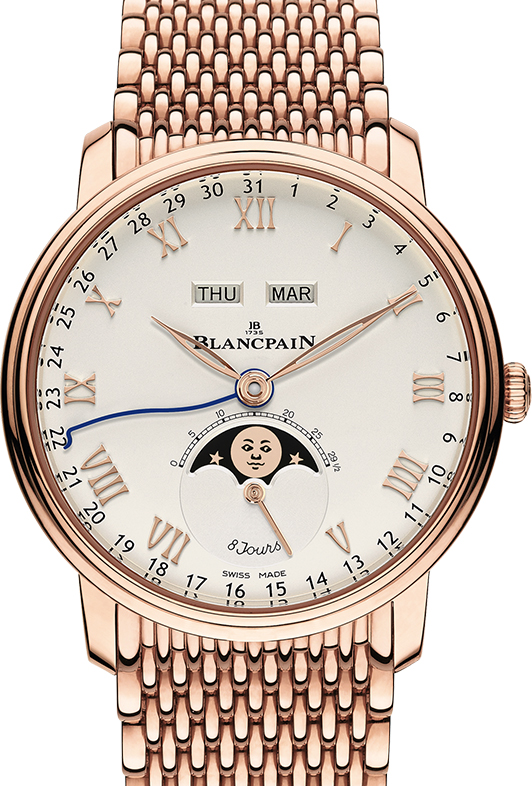 Астрономические часы Blancpain Villeret Moon Phase Complete Calendar '8 Jours' 6639-3642-MMB выпущены в круглом курпусе из розового золота, 18к. Размер составляет 42 х 13,7 мм, водонепроницаемость 30 м, часы со специальными корректорами индикации под ушками. Внутри корпуса установлен автоматический механизм, Калибр Blancpain 6639, обеспечивающий запас хода 8 дней. На белом циферблате отображаются часы, минуты, секунды, дата, день недели, месяц, фаза луны. Часы комплектуются браслетом из розового золота, 18к.