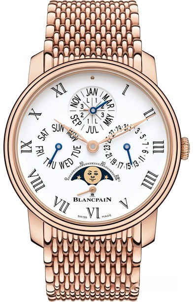 Villeret Quantieme Perpetuel 8 Jours демонстрирует гармоничное сочетание классического стиля и оригинальности часового механизма. Особенностью новой модели Blancpain Villeret 6659-3631-MMB есть функции вечного календаря и индикация фаз Луны. Способность отслеживать продолжительность месяца и високосный год согласно григорианскому календарю без регулировки до 2100 года. Плавные линии двухступенчатого корпуса изготовлен из розового золота 18к, диаметр 42 мм и толщина 13.5 мм. Элегантный, выпуклый циферблат белого цвета выполнен в сложной технике горячего эмалирования "grand feu". Мануфактурный часовой механизм, Калибр 5939A с автоподзаводом и запасом хода 192 часа. Вынесенный отдельный счетчик секундной стрелки и крупный индикатор фазы Луны в положении «6» часов. Запатентованные фирменные кнопки-корректоры расположены под ушками крепления ремешка. Часы поставляются на браслете из розового золота 18к.