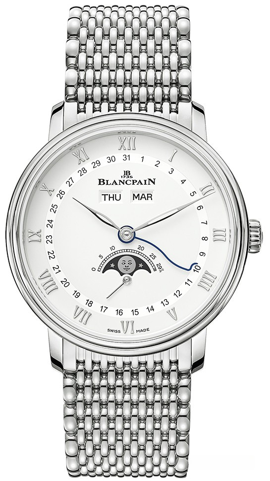 Часы Blancpain Quantieme Complet представлены в корпусе из нержавеющей стали размером 38 х 10.45 мм и водонепроницаемостью 30 метров. Внутри корпуса установлен автоматический механизм Blancpain 6763, обладающий запасом хода 100 часов. На белом циферблате отображаются часы, минуты, секунды, дата, день недели, месяц, фаза луны. Часы поставляются на браслете из нержавеющей стали.