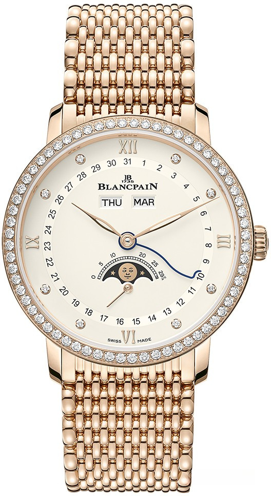 Часы Blancpain Quantieme Complet представлены в корпусе из розового золота 18к размером 38 х 10.45 мм и водонепроницаемостью 30 метров. Внутри корпуса установлен автоматический механизм Blancpain 6763, обладающий запасом хода 100 часов. На серебристом циферблате с 8-ю белыми бриллиантами отображаются часы, минуты, секунды, дата, день недели, месяц, фаза луны. Часы поставляются на браслете из розового золот 18к. Безель из белых бриллиантов.