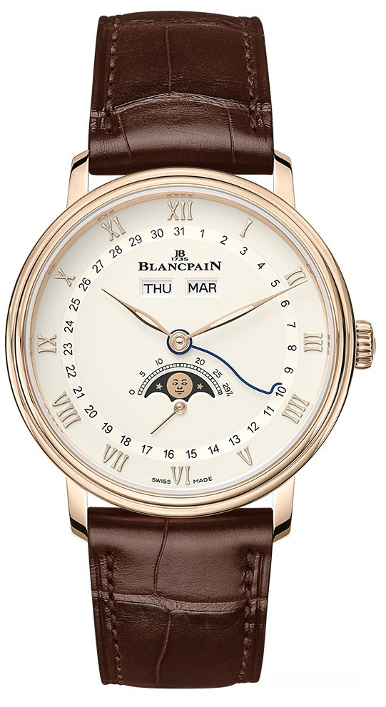 Часы Blancpain Quantieme Complet представлены в корпусе из розового золота 18к размером 38 х 10.45 мм и водонепроницаемостью 30 метров. Внутри корпуса установлен автоматический механизм Blancpain 6763, обладающий запасом хода 100 часов. На серебристом циферблате отображаются часы, минуты, секунды, дата, день недели, месяц, фаза луны. Часы поставляются на ремешке из кожи аллигатора с вставкой из розового золот 18к.