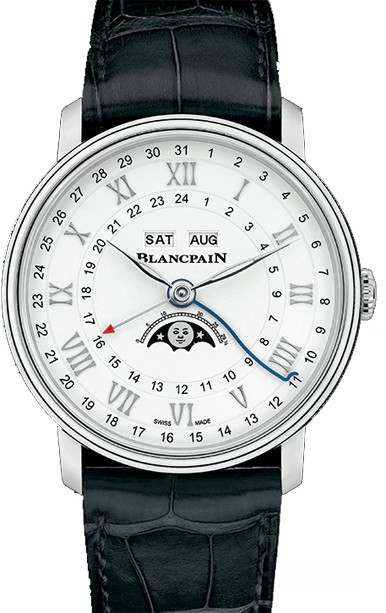 Часы Blancpain Villeret Quantieme Complet GMT представлены в корпусе из нержавеющей стали размером 40 х 11.8 мм и водонепроницаемостью 30 метров. Внутри корпуса установлен автоматический механизм. На белом циферблате отображаются часы, минуты, секунды, дата, день недели, месяц, фаза луны, время второго часового пояса. Часы поставляются на ремешке из кожи аллигатора с вставкой из нержавеющей стали.