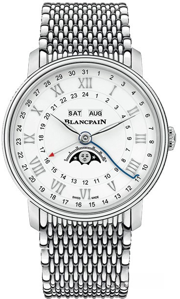 Часы Blancpain Villeret Quantieme Complet GMT представлены в корпусе из нержавеющей стали размером 40 х 11.8 мм и водонепроницаемостью 30 метров. Внутри корпуса установлен автоматический механизм. На белом циферблате отображаются часы, минуты, секунды, дата, день недели, месяц, фаза луны, время второго часового пояса. Часы поставляются на браслете из нержавеющей стали.
