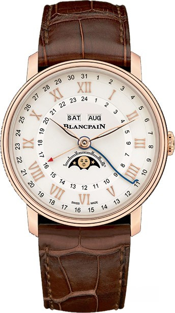 Часы Blancpain Villeret Quantieme Complet GMT представлены в корпусе из розового золота 18к размером 40 х 11.8 мм и водонепроницаемостью 30 метров. Внутри корпуса установлен автоматический механизм. На белом циферблате отображаются часы, минуты, секунды, дата, день недели, месяц, фаза луны, время второго часового пояса. Часы поставляются на ремешке из кожи аллигатора с вставкой из розового золота 18к.