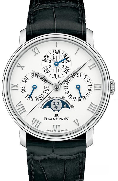 Часы Blancpain Villeret Quantieme Perpetuel представлены в корпусе из нержавеющей стали размером 40 х 11.1 мм и водонепроницаемостью 30 метров. Внутри корпуса установлен автоматический механизм, Калибр 5954 с запасом хода 72 часа. На белом циферблате отображаются часы, минуты, секунды, дата, день недели, месяц, цикл високосного года. Часы поставляются на ремешке из кожи аллигатора с вставкой из нержавеющей стали.