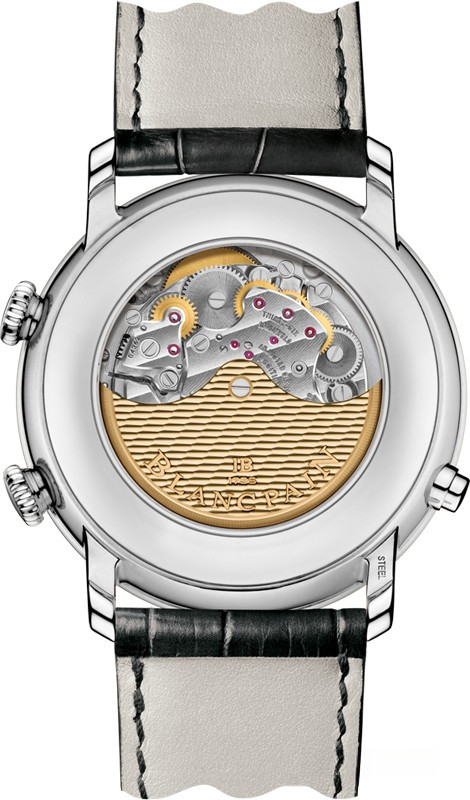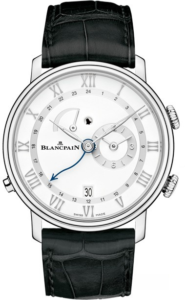 Blancpain 6640-1127-55B имеет выпуклый корпус с римскими цифрами из нержавеющей стали толщиной 12.1 мм и диаметром 40.3 мм. Циферблат белого цвета, выполненный в технике горячей эмали. Изогнутая стрелка синего цвета из вороненой стали, указывает будильник. Часы обладают двумя сложными функциями. Одна из них: время двух часовых поясов, что обеспечивает индикацию времени сразу двух часовых поясов на одном циферблате. Второй функцией есть функция будильника. Данное усложнение идеально подходит для современного путешественника, что позволяет запрограммировать часы на подачу звукового сигнала в заданное время. Помимо будильника, эта полезная особенность часов может также быть использована для напоминания о встрече. Часы защищает от царапин сапфировое стекло. Часовой механизм оснащен Калибром 1240H. Автоматический подзавод с запасом хода 45 часов. Элегантности часам придает ремешок из кожи аллигатора, подкладкой из кожи alzavel и раскладывающейся застежкой.