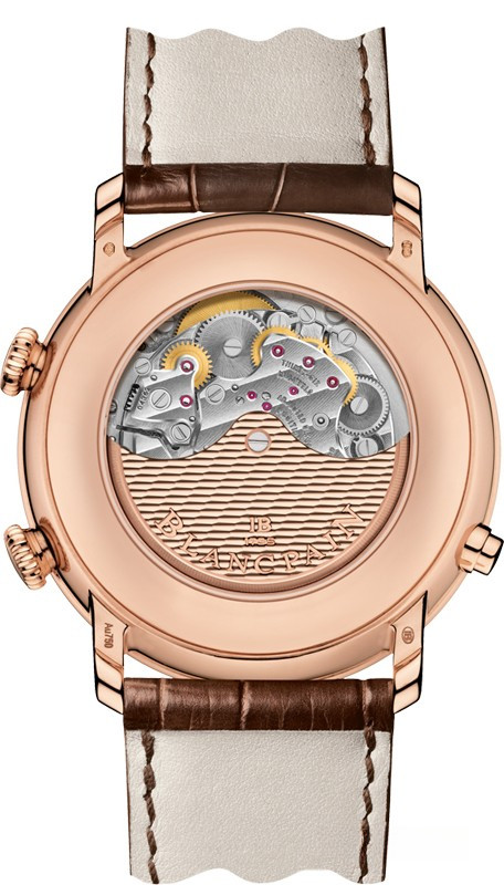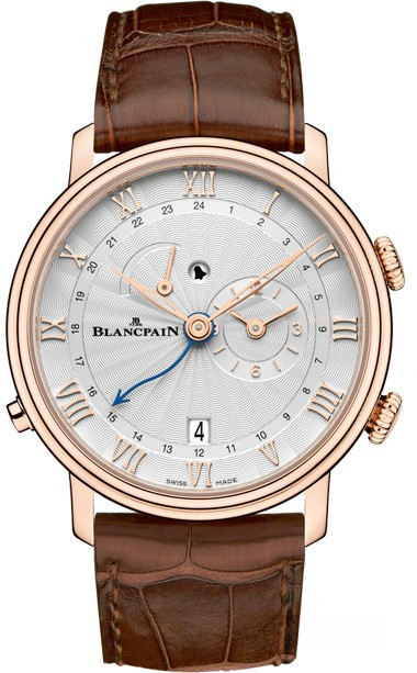 Blancpain 6640-3642-55B имеет выпуклый корпус с римскими цифрами из розового золота 18к толщиной 12.1 мм и диаметром 40.3 мм. Циферблат серебристый гильошированный. Изогнутая стрелка синего цвета из вороненой стали, указывает будильник. Часы обладают двумя сложными функциями. Одна из них: время двух часовых поясов, что обеспечивает индикацию времени сразу двух часовых поясов на одном циферблате. Второй функцией есть функция будильника. Данное усложнение идеально подходит для современного путешественника, что позволяет запрограммировать часы на подачу звукового сигнала в заданное время. Помимо будильника, эта полезная особенность часов может также быть использована для напоминания о встрече. Часы защищает от царапин сапфировое стекло. Часовой механизм оснащен Калибром 1240H. Автоматический подзавод с запасом хода 45 часов. Элегантности часам придает коричневый ремешок из кожи аллигатора с застежкой из розового золота 18к.