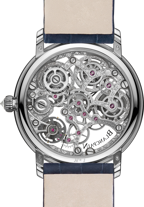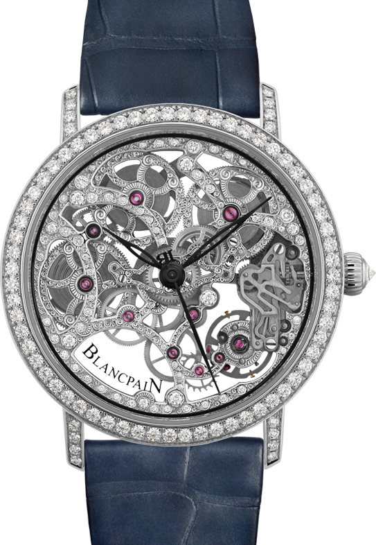 Часы Blancpain Villeret Squelette 8 Jours 6633-1900-55B выпущены в круглом корпусе из белого золота, 18к. Размер составляет 38 х 9,43 мм, водонепроницаемость 30 м, с безелем из белых бриллиантов. Внутри корпуса установлен скелетированный механизм с ручным заводом, Калибр 1333SQ, обеспечивающий запас хода 192 часа. На серебристом циферблате с белыми бриллиантами отображаются часы, минуты, секунды. Часы комплектуются ремешком из кожи аллигатора с вставкой из белого золота, 18к.