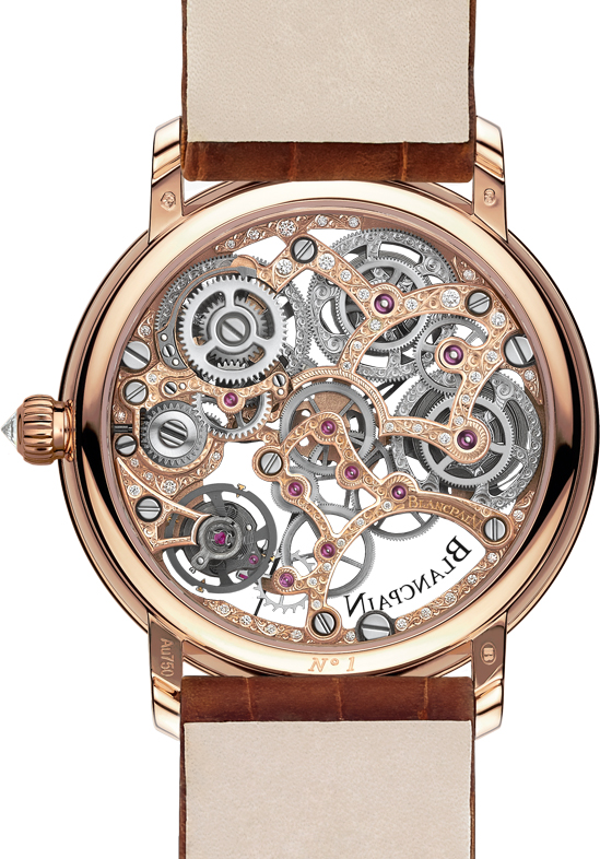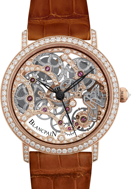 Часы Blancpain Villeret Squelette 8 Jours 6633-2900-55B выпущены в круглом корпусе из розового золота, 18к. Размер составляет 38 х 9,43 мм, водонепроницаемость 30 м с безелем из белых бриллиантов. Внутри корпуса установлен скелетированный механизм с ручным заводом, Калибр 1333SQ, обеспечивающий запас хода 192 часа. На золотистом циферблате с белыми бриллиантами отображаются часы, минуты, секунды. Часы комплектуются ремешком из кожи аллигатора с вставкой из розового золота, 18к.