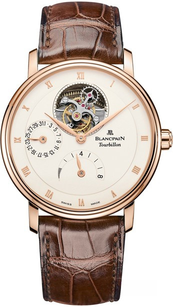 Часы Blancpain Villeret Tourbillon 6025-3642-55B с турбийоном выпущены в круглом корпусе из розового золота, 18к. Размер составляет 37,5 х 10,3 мм, водонепроницаемость 30 м. Внутри корпуса установлен автоматический механизм, Калибр Blancpain 25А, обеспечивающий запас хода 7 дней. На светло-бежевом циферблате отображаются часы, минуты, секунды, дата, запас хода. Часы комплектуются ремешком из кожи аллигатора с золотой, 18к раскладывающейся застежкой.