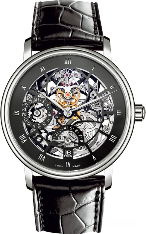 Часы Blancpain Villeret Tourbillon Skeleton 6025A-3430-55 с турбийоном выпущены в круглом корпусе из платины. Размер составляет 38 х 10,3 мм, водонепроницаемость 30 м. Внутри корпуса установлен автоматический механизм, Калибр Blancpain 25, обеспечивающий запас хода 7 дней. На черном с серебристом циферблате отображаются часы, минуты, дата, запас хода. Часы комплектуются ремешком из кожи аллигатора с платиновой вставкой.