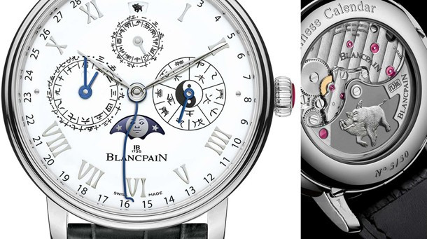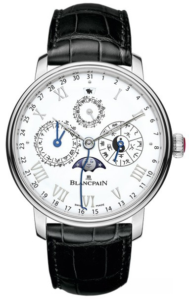Часы Blancpain Villeret Traditional Chinese Calendar представлены в корпусе из белого золота 18к размером 45 x 15 мм и водонепроницаемостью 30 метров. Внутри корпуса установлен автоматический механизм, Калибр 3638, обладающий запасом хода 7 дней. На белом циферблате отображаются часы, минуты, секунды, дата, день недели, месяц, фаза луны, знаки зодиака, пять элементов, десять небесных стволов. Модель комплектуется ремешком из кожи аллигатора с вставкой из белого золота 18к.