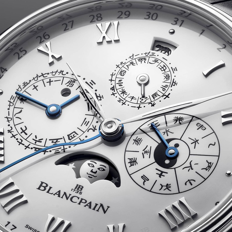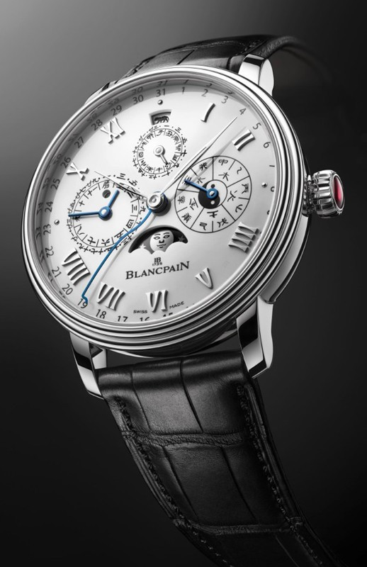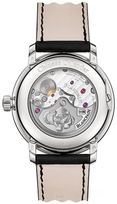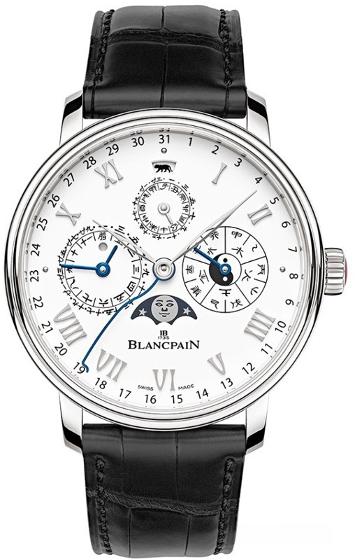 Часы Blancpain Villeret Traditional Chinese Calendar представлены в корпусе из платины 950 размером 45 x 15 мм и водонепроницаемостью 30 метров. Внутри корпуса установлен автоматический механизм, Калибр 3638, обладающий запасом хода 7 дней. На белом циферблате отображаются часы, минуты, секунды, дата, день недели, месяц, фаза луны, знаки зодиака, пять элементов, десять небесных стволов. Модель комплектуется ремешком из кожи аллигатора с вставкой из платины 950.