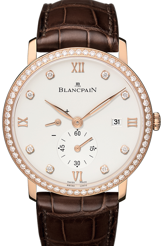 Часы Villeret Ultra-Slim Hand-Winding 40mm Small Seconds Power Reserve 6606-2987-55B выпущены в круглом корпусе из розового золота, 18к. Размер составляет 40 х 8,9 мм, водонепроницаемость 30 м, с безелем из белых бриллиантов. Внутри корпуса установлен автоматический механизм, Калибр 1150, обеспечивающий запас хода 100 часов На белом циферблате с 8-ю белыми бриллиантами отображаются часы, минуты, секунды, дата, запас хода. Часы комплектуются ремешком из кожи аллигатора с вставкой из розового золота, 18к.