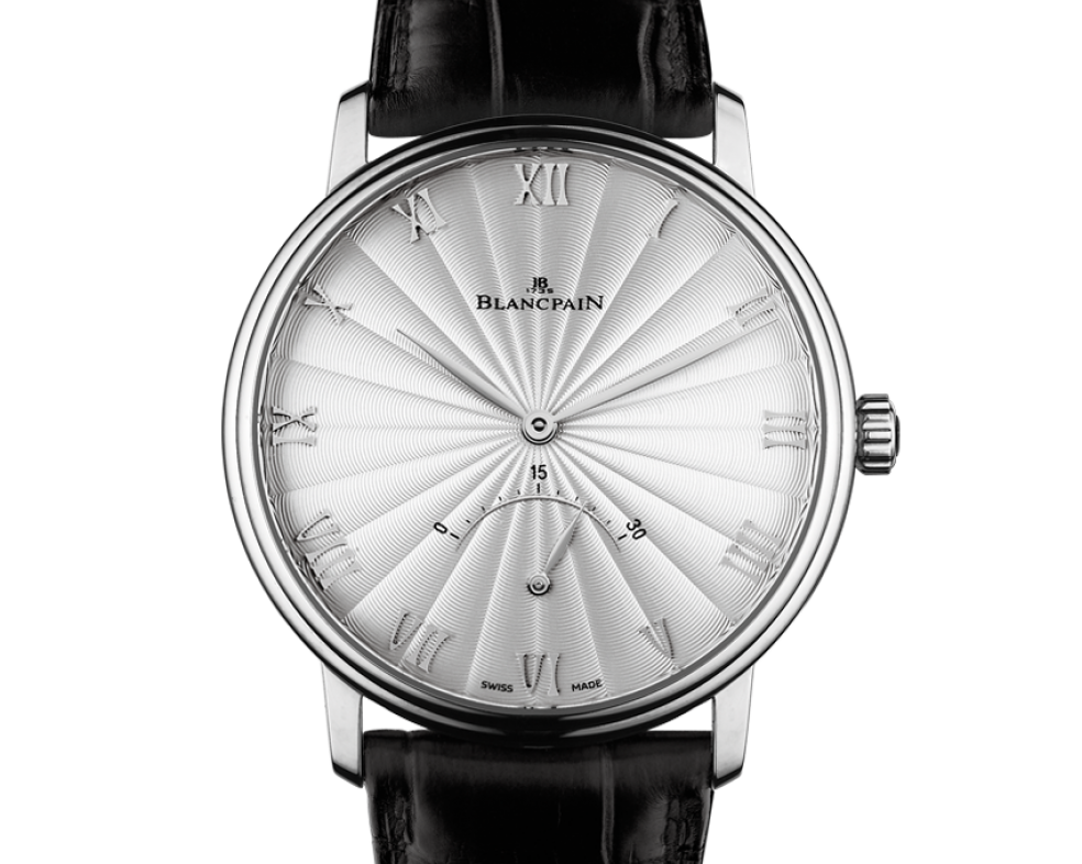 Часы Blancpain Villeret Ultra-Slim Retrograde Small Seconds 6653-1542-55B выпущены в круглом корпусе из белого золота, 18к. Размер составляет 40 х 10,83 мм, водонепроницаемость 30 м. Внутри корпуса установлен автоматический механизм, Калибр 7663, обеспечивающий запас хода 72 часа. На серебристом гильошированном циферблате отображаются часы, минуты, секунды, дата. Часы комплектуются ремешком из кожи аллигатора с вставкой из белого золота, 18к.