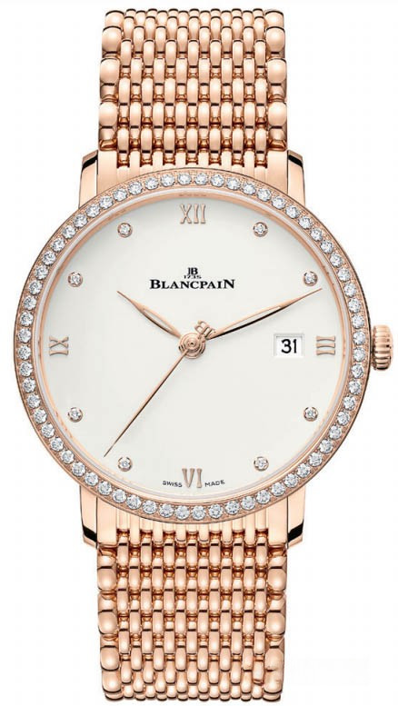 Часы Blancpain Villeret Ultraplate 6224 представлены в корпусе из розового золота 18к размером 38 х 8.35 мм и водонепроницаемостью 30 метров. Внутри корпуса установлен автоматический механизм Blancpain 1150, обладающий запасом хода 100 часов. На серебристом циферблате с 8-ю белыми бриллиантами отображаются часы, минуты, секунды и дата. Часы поставляются на браслете из розового золота 18к. Безель из белых бриллиантов.