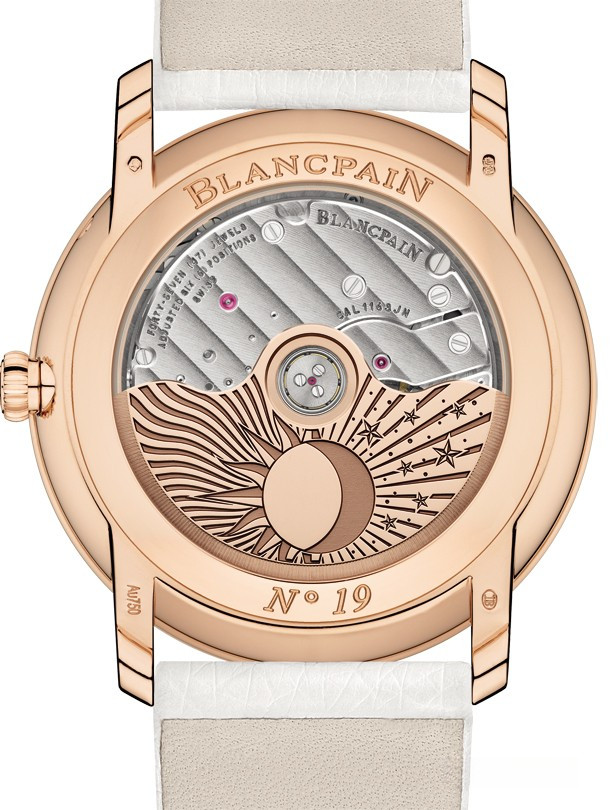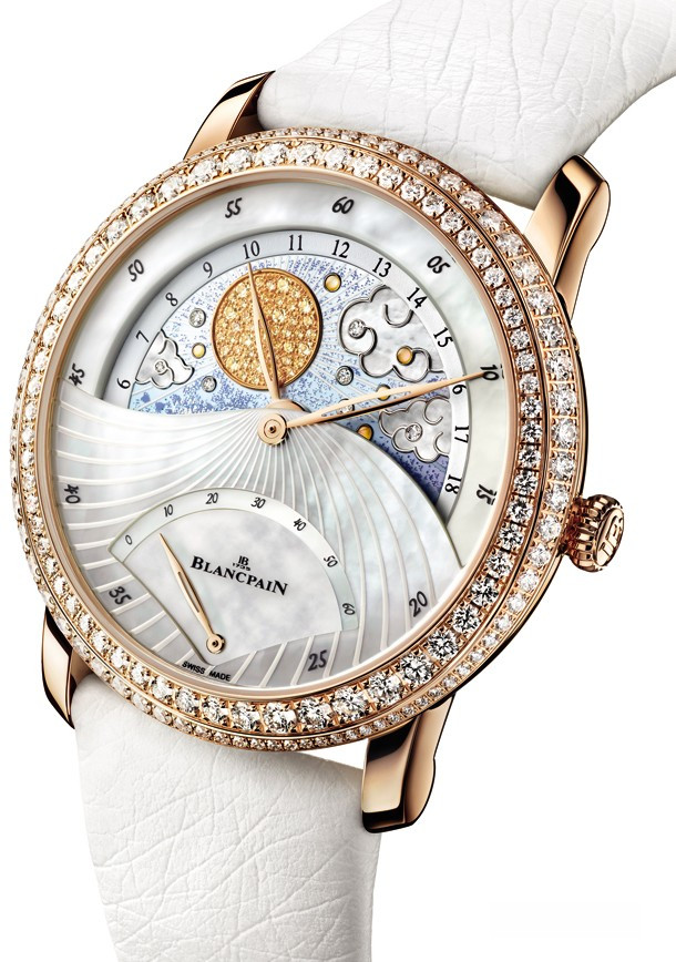 Оснащенные эксклюзивным механизмом, предусматривающим два ретроградных указателя, новые часы Jour Nuit (День Ночь) отличаются существенными техническими новшествами и высочайшим мастерством изготовления циферблата. Созданный на базе калибра 1150, механизм часов Jour Nuit имеет больший диаметр. Ротор автоподзавода, отполированный и декорированный гравировкой, был увеличен для улучшения общего вида сложного механизма, видимого через сапфировую заднюю крышку корпуса. При диаметре 40 мм, новые часы обладают гармоничным балансом между диаметром и толщиной, которая составляет менее 12 мм. Циферблат выполнен полностью из перламутра и делится на три части, структурированные на четырех уровнях. Разно высотность создает впечатление большей визуальной глубины. Потребовалась очень тщательная и кропотливая работа для того, чтобы сформировать эти несколько уровней на поверхности перламутра, поскольку нанесенный на основу из нейзильбера он постепенно, с каждым уровнем становился тоньше и, следовательно, более хрупким. Диск индикации «День/Ночь» поворачивается два раза в сутки. Луна оформлена 50-ю бриллиантами, а Солнце – 50-ю желтыми сапфирами. В новой модели присутствуют такие элементы фирменного дизайна Blancpain, как двухступенчатый корпус с закругленными краями. Безель инкрустирован 140 бриллиантами в виде двух спиралей, опоясывающими корпус. Часы Jour Nuit снабжены белым ремешком из кожи страуса.