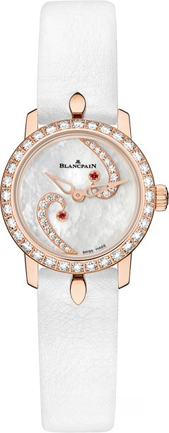 Blancpain отдает дань коллекции Ladybird, которая сыграла столь важную роль в истории женских часов. Новый автоматический механизм, 6150 и сегодня остается одним из самых маленьких в мире. Белый жемчужный циферблат украшен 2-мя красными рубинами и белыми бриллиантами. Кожаный ремешок придает часам исключительное совершенство. Безель инкрустирован 32 бриллиантами. Листьевидные стрелки указывают часы и минуты. Что касается корпуса, он сделан из розового золота. Прозрачная задняя крышка позволяет увидеть работу механизма.