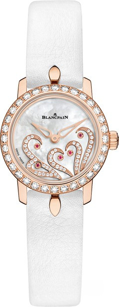Blancpain отдает дань коллекции Ladybird, которая сыграла столь важную роль в истории женских часов. Новый автоматический механизм, 6150 и сегодня остается одним из самых маленьких в мире. Белый жемчужный циферблат украшен 5-ю красными рубинами и белыми бриллиантами. Кожаный ремешок придает часам исключительное совершенство. Безель инкрустирован 32 бриллиантами. Листьевидные стрелки указывают часы и минуты. Что касается корпуса, он сделан из розового золота. Прозрачная задняя крышка позволяет увидеть работу механизма.
