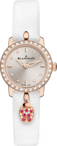 Blancpain отдает дань коллекции Ladybird, которая сыграла столь важную роль в истории женских часов. Новый автоматический механизм, 6150 и сегодня остается одним из самых маленьких в мире. Серебристый циферблат украшен 8-ю белыми бриллиантами. Кожаный ремешок придает часам исключительное совершенство. Безель инкрустирован 32 бриллиантами. Листьевидные стрелки указывают часы и минуты. Что касается корпуса, он сделан из розового золота. Прозрачная задняя крышка позволяет увидеть работу механизма.